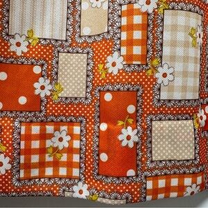 Gorgeous retro vintage 60s/70s handmade short sleeve top. This boxy blouse is orange, white, beige, and yellow with an allover flower and patchwork pattern. Square neckline, thick hemming, well made.