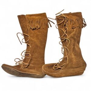 Vintage 60s/70s brown leather suede fringe moccasins boots Size: 9.5