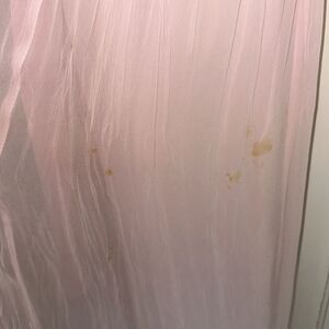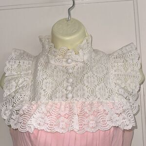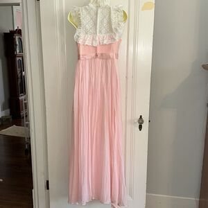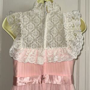 Vintage 60s/70s High Neck White Lace Pink Chiffon Pleated Prom Dress