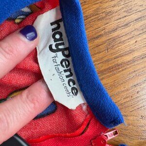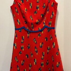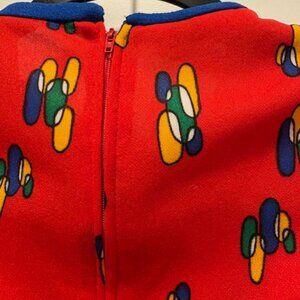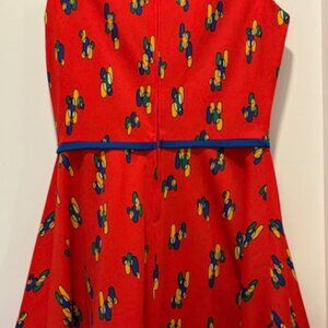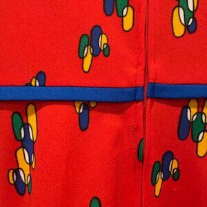 In excellent condition, it features a bold red base with a whimsical multicolor abstract print, accented with royal blue piping along the neckline, waist, and hem. A striking piece with classic mod flair.