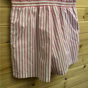 Pink & Off White Pinstripe Short Sleeve Button Front Romper With Cinched Waist & Pockets