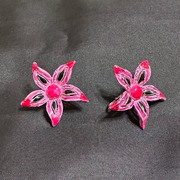 Vintage 1960s Arthur Pepper ART signed Estate jewelry - pink and black flower enamel on metal clip-on earrings. In great vintage condition enamel has a little chipping at the very edges but that adds to the charm and it seems one of the clips is slightly off kilter .