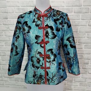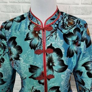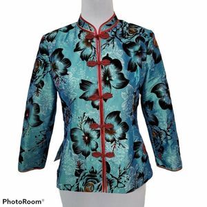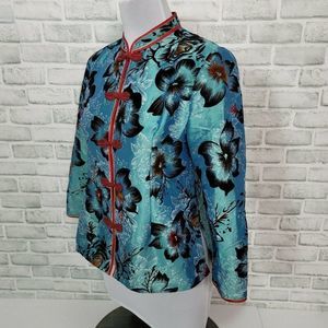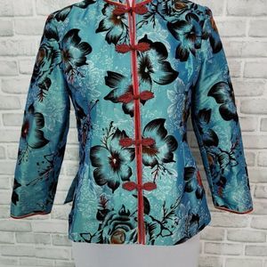 Details: Vintage 60s Beautiful Asian Silk Jacket Velvet Floral Jacket Blouse Top has shoulder pads and toggle buttons