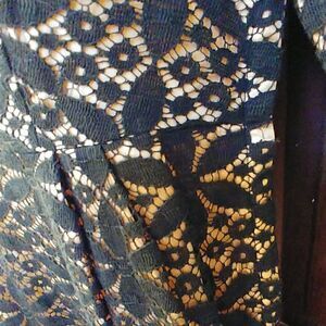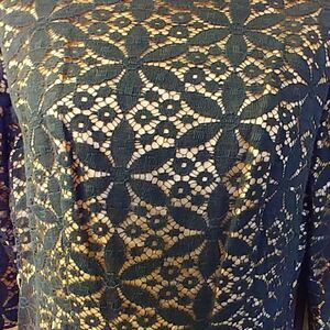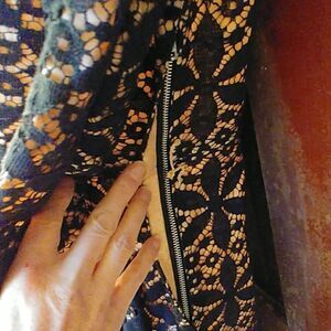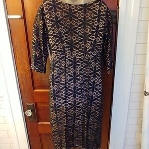 Lovely black floral lace over gold satin dress. Pleated at the waist. Zips up side. Loops, no belt. Measurements laid flat: 18" pit to pit, 3/4 length sleeves 16", waist 16", hips 19", shoulder to hem 42". Good vintage condition. Some lace damage on left shoulder and left waist near zipper as shown in photos. A lovely holiday or special occasion dress.