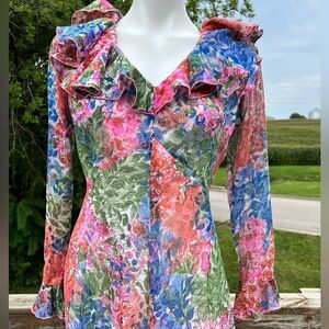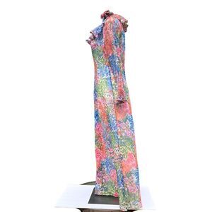 Vintage 60s Floral Print Ruffle Neck Long Sleeve Maxi Dress