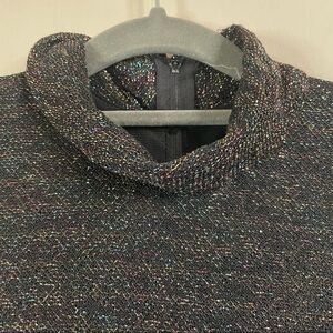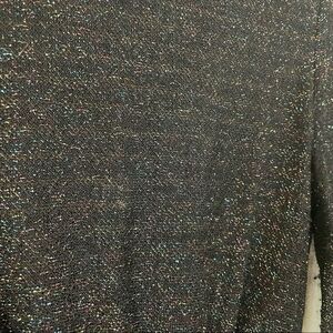 This beautiful vintage dress is in excellent pre-owned condition. There is a little fraying around the neck, but it’s not terrible. Also, there was probably a belt with it at one point, but it’s gone now. The belt loops are still attached so any belt can be used. The top is black with multi-color metallic tread weaved in. The waist is elastic and can stretch. The dress is black chiffon over a black polyester lining. It zips in the back. The tag says it’s a size 8, but since it’s vintage the approximate measurements are below.