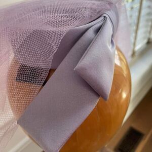 Vintage early 60s lavender I dream of Jeannie style hat or topper with two small hair combs that should fix it to your hair. The mesh can be folded back like a veil or worn for a 360° look. The mesh is speckled with lavender rhinestones. Some are a little muddy looking and not quite as sparkly as they used to be. Hair combs attached to fasten to your hair. The band and half bow are satin. The woman who owned this had a small head and the inside measures approximately 15 inches around or 5 inches across. The band is flexible and the mesh is double layer and fans out approximately 8 inches from the band.