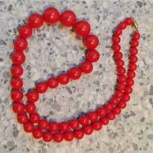 Cheerful, graduated size cherry red beads compromise this adorable mid-length vintage necklace. Gold barrel screw closure. Measures about 14" drop, largest bead is about .75" wide. Very good condition.