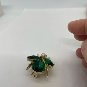 Vintage 60s Rhinestone Flying Insect Bug Brooch Pin Green Gold White Pearl