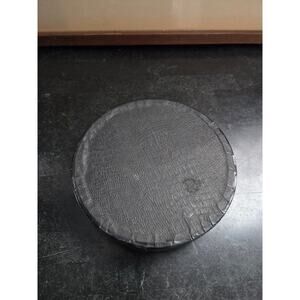 This round ashtray measures 6.25 inches in diameter and features four cigarette rests integrated into a heavy, clear glass insert. The outer body is covered in black textured faux leather with gold band detailing, offering a refined, masculine look that fits perfectly in MCM or vintage barware collections.