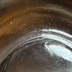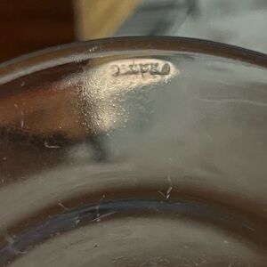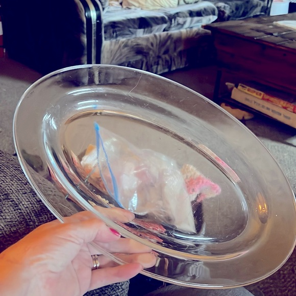 Clear glass platter Very plain but pretty Can’t make out manufacturer No chips or cracks deep dish