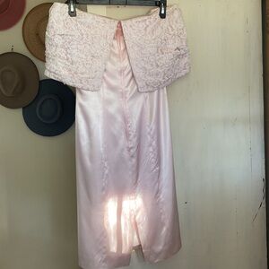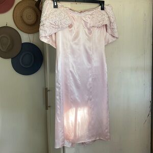 Vintage handmade off the should pencil dress with slit at back ( the slip is a little pull see pic) fits like a size 6 does not have fabric details color is pale pink