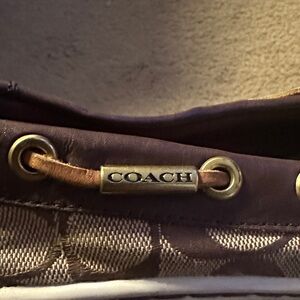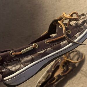 Coach boat shoes with signature monogram fabric. Leather trim and laces in tan. Gold-tone hardware with Coach logo. Rubber white sole. Classic casual style.