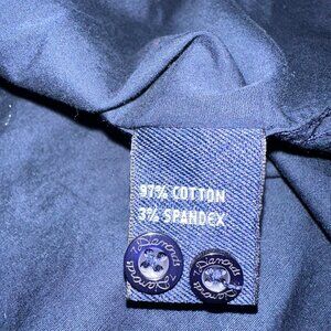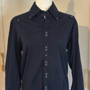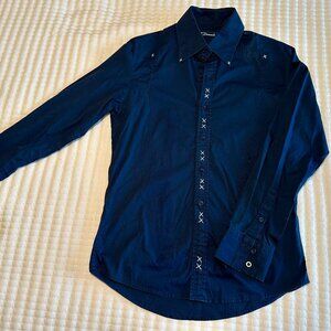 Vintage, Circa mid-2000's. Polished and modern men’s long sleeve button-down from 7 Diamonds. Deep navy with unique stitched X details on the placket, collar, and shoulders for added edge. Crafted from a breathable cotton-spandex blend with a bit of stretch for all-day comfort.
