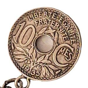This rope chain French coin charm bracelet is 7” long and weights 25 grams. The coins are dated 1923, 1926, 1932, 1935 and 1938. Some pictures show both sides of coin. Pre-owned, excellent condition. Spring ring clasp perfect, no stretched ring attachments, links and coins show no damage. Needs a thorough cleaning. Interested, make an offer. From a smoke and pet hair free home.