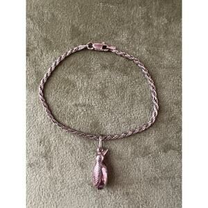 This vintage bracelet features a 7-inch sterling silver twisted rope chain with a secure lobster clasp and a solid 3D penguin charm. The detailed charm and elegant rope chain make this a playful yet timeless piece for any jewelry collection.