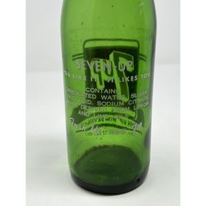 This vintage 7 Up green bottle is a highly collectible item for those interested in soda bottles. The bottle has a capacity of 1 pint or 12 oz and was produced in 1965. It features the classic 7 Up branding and is in good overall condition.