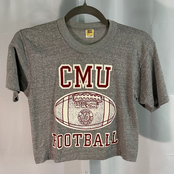 Amazing 1970s Velva Sheen CMU football tee! Late 70s, or very early 80s fan shirt in fabulous condition. It's cropped cut, which a lot of men and women wore during that time, so it is a unisex shirt. It came from the home of a retired CMU biology professor and his wife. It has a print of a Wilson football, which at the time was the official intercollegiate football. Just a wonderful vintage tee. The fabric is still thick, the artwork is in great condition, the tag is in good condition. Looks like it was worn maybe once for game day, and then just stored. It still has the holes in the tag from the price tag, which usually diminish with washing.