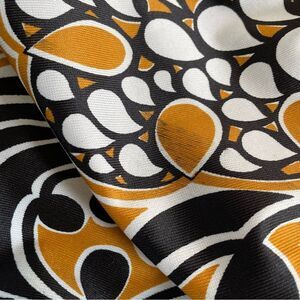 Vintage 1971 Ameritex Co mod abstract organic trippy 60s 70s retro print in white, black and a golden tan color. No fabric content but it feels like polyester with a little bit of stretch. There is approximately an inch of edge along two sides and the fabric itself is 66“ x 64“ or approximately 1.83 x 1.77 yards. There is some color transfer on parts of the fabric where the black seems to smear. I believe this is a factory issue and maybe this was a seconds? Still an incredibly cool fabric that is representative of its time
