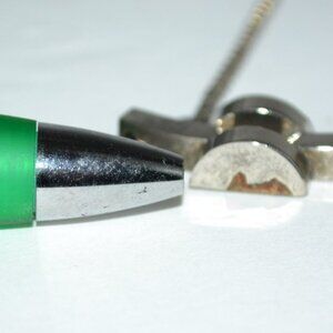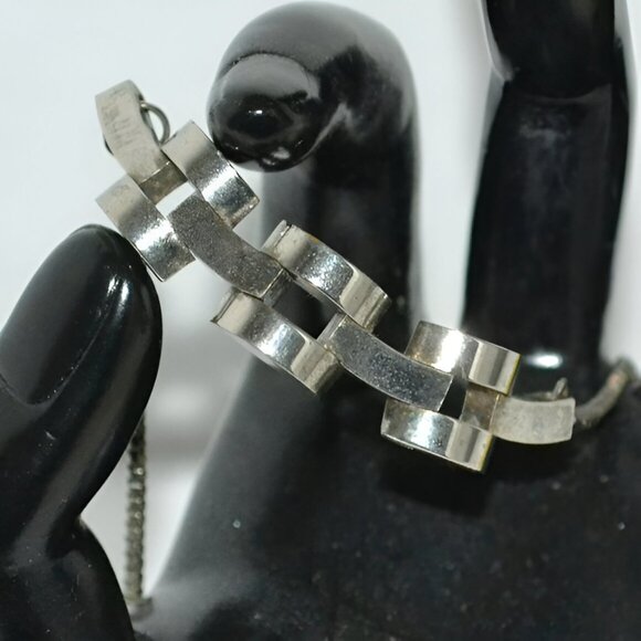 Offered is this rare & fabulous mid century modern one-of-a-kind necklace from a MD estate sale. The unisex necklace pendant is brass-mixed metal based & silver plated, stainless or other silver tone plating. No hallmarks or stamps, material has not been metallurgy tested. The item is in average pre-owned vintage condition with scratching, loss of "plating" in one small place (imaged), & tarnishing of chain. The metal pendant cleaned up nicely with tarnish remover.