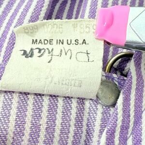 Details: These are a vintage pair of OshKosh B'gosh overalls, likely from the 1980s or 1990s. This is the sought-after "Vestbak" style with the V-shaped back. Made in the U.S.A., they feature a classic railroad pinstripe pattern in the Rare color: purple and white, along with the signature brass-colored buttons with adjustable fit. A perfect piece for a vintage-loving kid, with a nostalgic and durable design. A name has been written on the back of the paper tag.