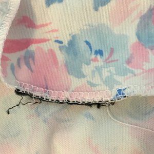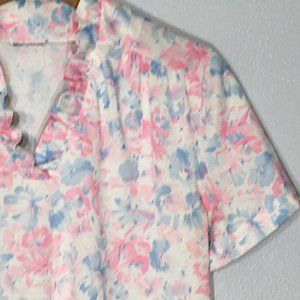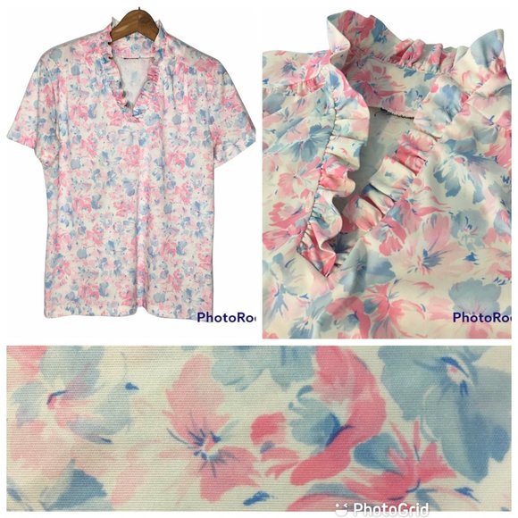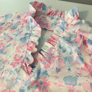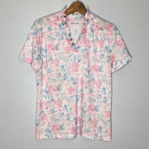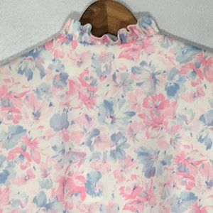 Vintage 1970s 1980s pastel pink and blue floral blouse with high ruffled neck and ruffled V neckline. Super cute yume kawaii and soft girl asthetic. Yoke with pleats and short sleeves. Pair with some dark lipstick and Doc Martens for a pastel grunge vibe. Or just wear as a pretty top out to lunch or at the office