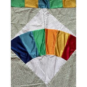 d. is Polyester Silkie colors of Blue, Blue, Green, Orange, Yellow, Red in Fan Motif on