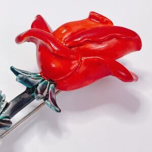 Features: Glossy enamel finish; sculptural rose design; red petals with shaded accents; green leaves and stem; silver tone reverse; rollover safety clasp; dimensional vintage construction.