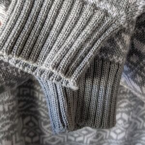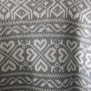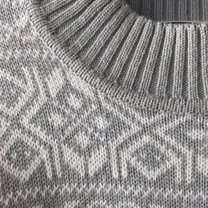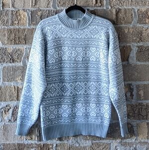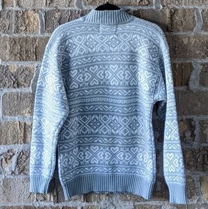 Vintage late 1970s/ early 1980s mock neck ski sweater from Summit County. True vintage. White and light gray allover intarsia knit. Ribbed knit collar, cuffs, and hem. Neutral Kawaii aesthetic. Made in Hong Kong. 70% acrylic 30% wool. No flaws.