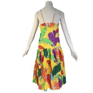 Great vintage dress from Two Potato! Bright colors floral print with yellow background. One small button at back. Small repair to back under button opening, see photos for closeup. No size label but measures approx. size small. Bust approx.34, waist approx. 36, length approx. 44 inches. Fabric feels like cotton.