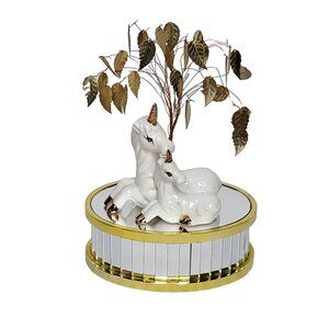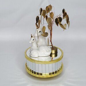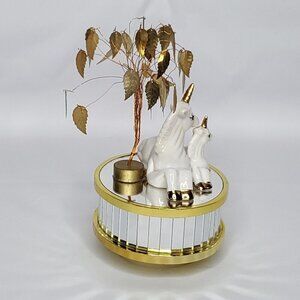 Vintage 70s 80s Unicorn Music Box Mom Baby Metal Tree Rotates White Gold Fantasy