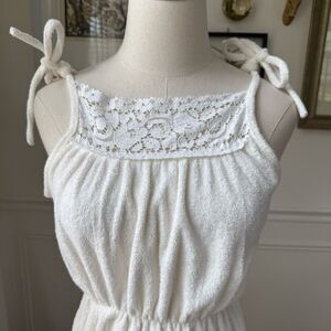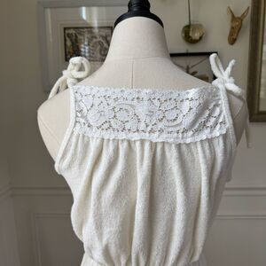 Vintage late 70s early 80s white terrycloth sundress or swim cover up (or both!) with elastic waist, shoulder ties and lace at the top front and back. There is a ruffle along the hem. Pull over styling. There are no tags to be found anywhere in this dress, but the stitching does not look handmade. I cannot verify that though. Laying flat measures approximately 39 inches shoulder to him, 12 inches straight across the elastic waist when relaxed stretching to 20 inches without much resistance and 19 inches armpit two armpits. On my size medium dress form for scale. No noted flaws.