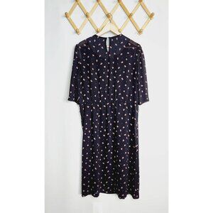This vintage black floral midi dress features sheer fabric, 3/4 sleeves, and pleats. Perfect for a grunge look, it fits medium to large sizes and exudes retro charm.