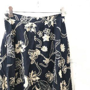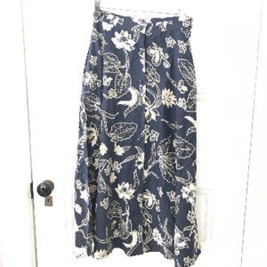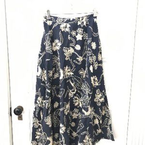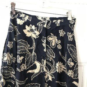 Vintage Anne Klein II 1970s navy blue and beige long floral silk midi skirt with A line shaping and button front