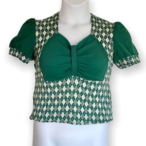 Vintage 70s? Stretchy nylon knit crop top. Green, white, & yellow argyle plaid print with rib knit green color block panels at sleeves and bust. Gathered bust. Ties in the back. In great vintage condition, does have a small area where the hem has come out (see photo).