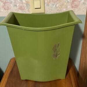 Vintage 70s Avocado Green Small Wastebasket Gold Leaves Mid Century Modern