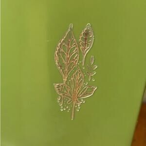 Vintage 70s Avocado Green Small Wastebasket Gold Leaves Mid Century Modern 11"