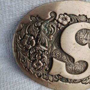 Vintage 70s Award Design Medals Inc. Brass "S" Belt Buckle Floral Flowers