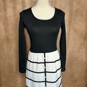 Long sleeve pullover dress with a black ribbed top, & round neckline. White skirt with textured rectangle squares and faux buttons. Vintage 1970s, Union Made in USA.