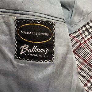 This is a vintage 70s BOLD PLAID suit jacket blazer in a red, white, and black checkered pattern. The brand is Michaels/Stern, size type is Regular with a size of 42. It features a two-button style and falls under the Men's Department. The jacket/coat length is Regular, and it is a stylish choice for a size 42 gentleman looking for a unique and retro-inspired blazer.
