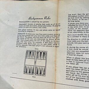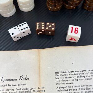 This vintage backgammon set includes a complete set of playing pieces, dice, and a rules sheet. The set features classic brown and white pieces, ideal for enthusiasts of traditional board games.
