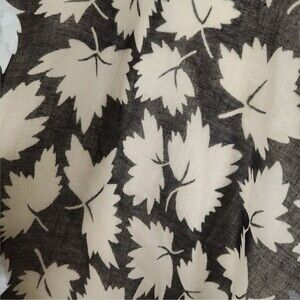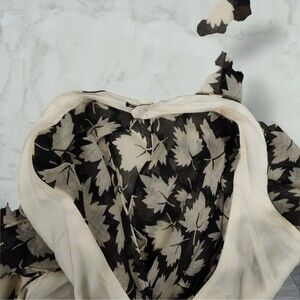 Vintage 70's backless halter dress with cape like drape on neckline that covers shoulders and back, empire waist with bust darts, fit and flare, about below the knee to midi length, graphic maple leaf print. Lined with back zipper.