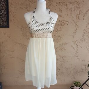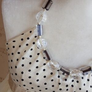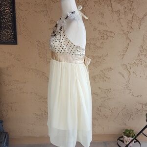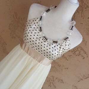 Excellent used condition. Beaded halter ties. Satin polka dotted top. Chiffon skirt. Striped Bow-Tie at back. Lined. Side zipper with hook and eye closure.