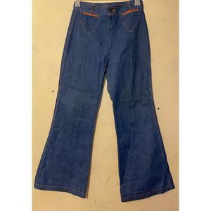 Nice vintage bell bottom jeans stitching in orange with brown leather accents waist measures 15”x2=30” inseam 30” sz 31/11 stain on bottom pants leg please see photos