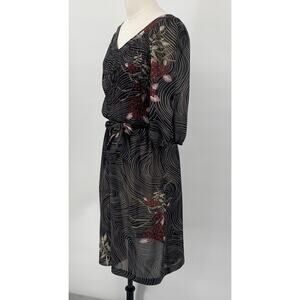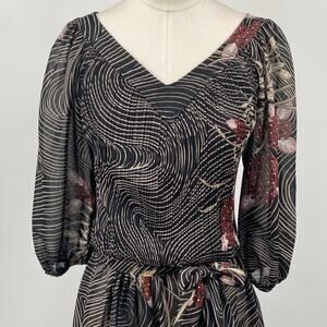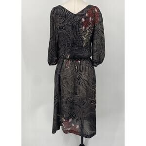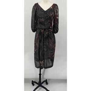 Vintage 70s Belted Abstract Floral Swirl Print Dress V Neck Blouson Black Red XS