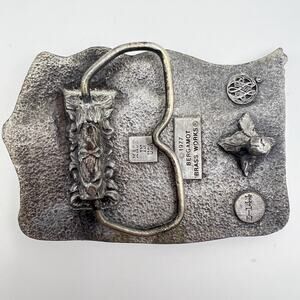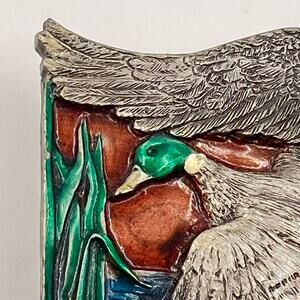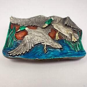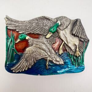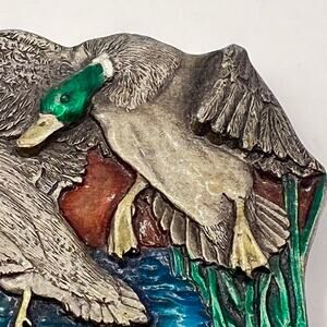 Vintage 70s Bergamot Pewter Enamel Ducks Belt Buckle Marshland Hunting Mallard