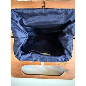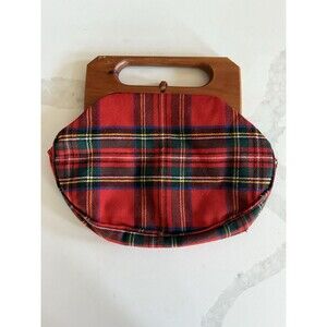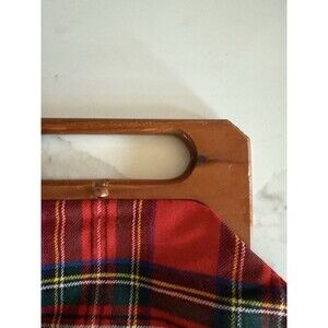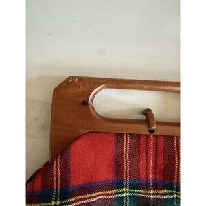 The Vintage 70s Bermuda Bag by Triminghams is a stylish and unique purse made of wool in a plaid tartan design, with red, yellow, green, and black colors. The bag features wooden handles, adding a touch of retro charm to the Mod/GoGo look of the 1970s. Some marks on wood handle. 11 wide x 10 tall.