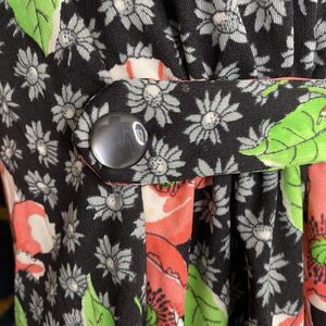 This is a Rare One of a kind black full maxi long sleeve Hippie Bohemian Dress. Black with amazing floral design. Talon back zipper with 2 clasps for closure on neck. V neck. Pleated. Faux button belt under chest.