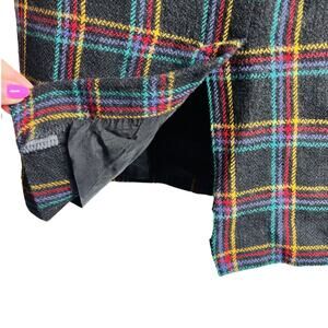 Vintage 1970s plaid pleated skirt by Ports Trademark Design, made in Canada. Features a colorful tartan pattern in red, yellow, blue, and green on a black base. Mid-length silhouette with center back zipper and dual button closure. Expertly tailored and fully lined — a timeless piece for classic or dark academia-inspired wardrobes.