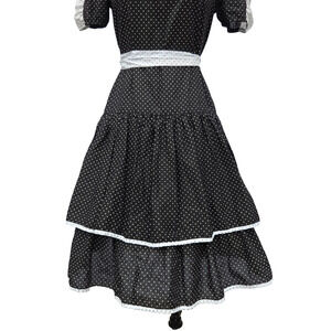 Super cute vintage black and white polka dot fit and flare midi dress with tiered skirt, puff sleeves, and contrast belt. Size tag worn off, see measurements for best fit. Pullover. The elastic in the sleeves is beyond its useful life, it can be replaced or worn as is. Shown on size 4 dress form over crinoline.